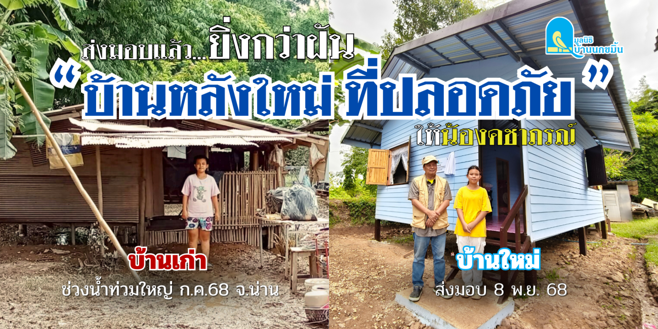 วันที่ 8 พฤศจิกายน 2568 บ้านน้ำครกเก่า ตำบลกองควาย อำเภอเมืองน่าน จังหวัดน่าน มูลนิธิบ้านนกขมิ้น ภายใต้ โครงการกองทุนที่อยู่อาศัย ร่วมกับ เทศบาลตำบลกองควาย จังหวัดน่าน ส่งมอบบ้านหลังใหม่ให้แก่ เด็กหญิงคชาภรณ์ ส่างกอง และครอบครัว ซึ่งได้รับความเดือดร้อนจากเหตุอุทกภัยครั้งใหญ่เมื่อเดือนกรกฎาคมที่ผ่านมา